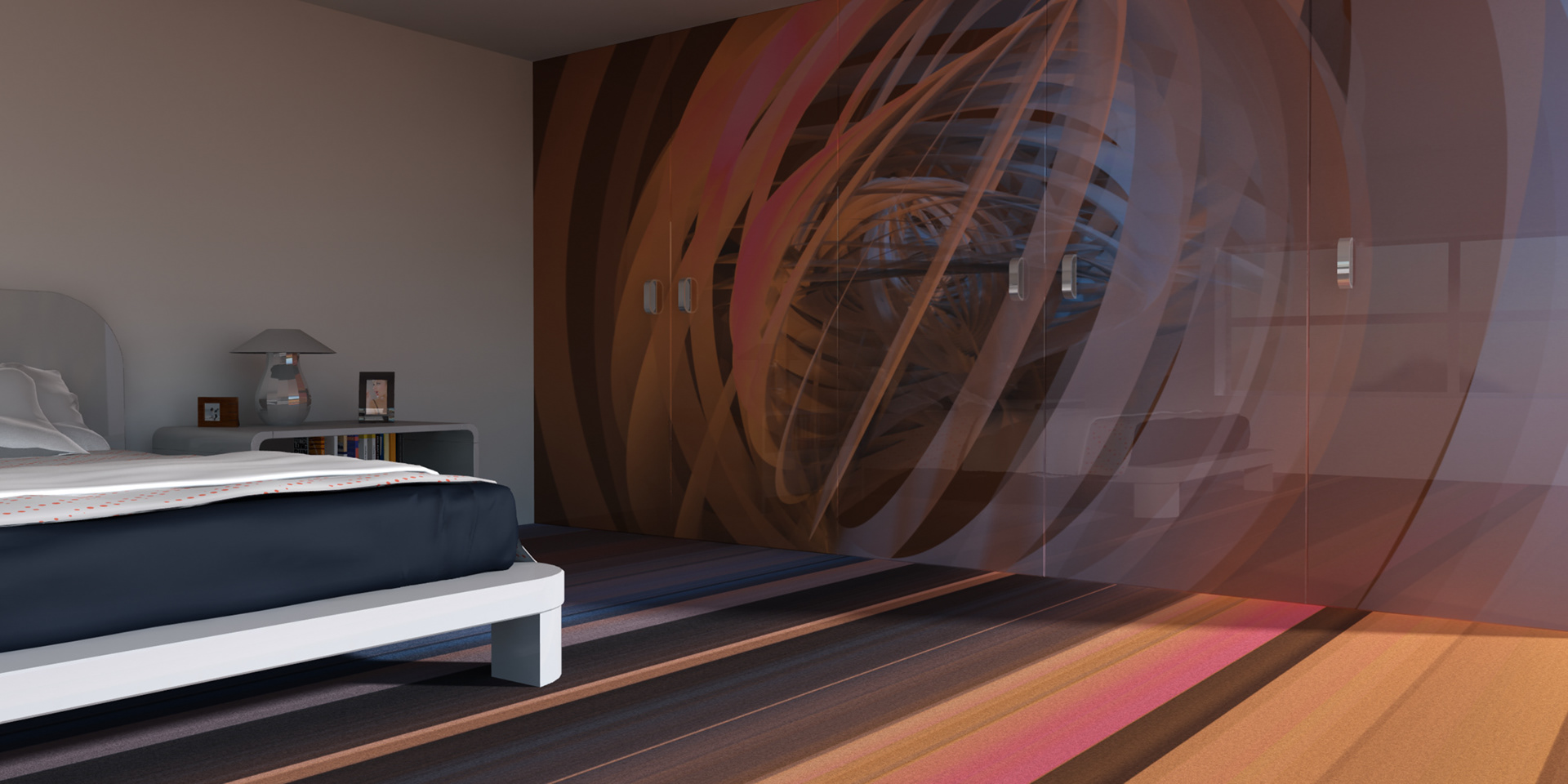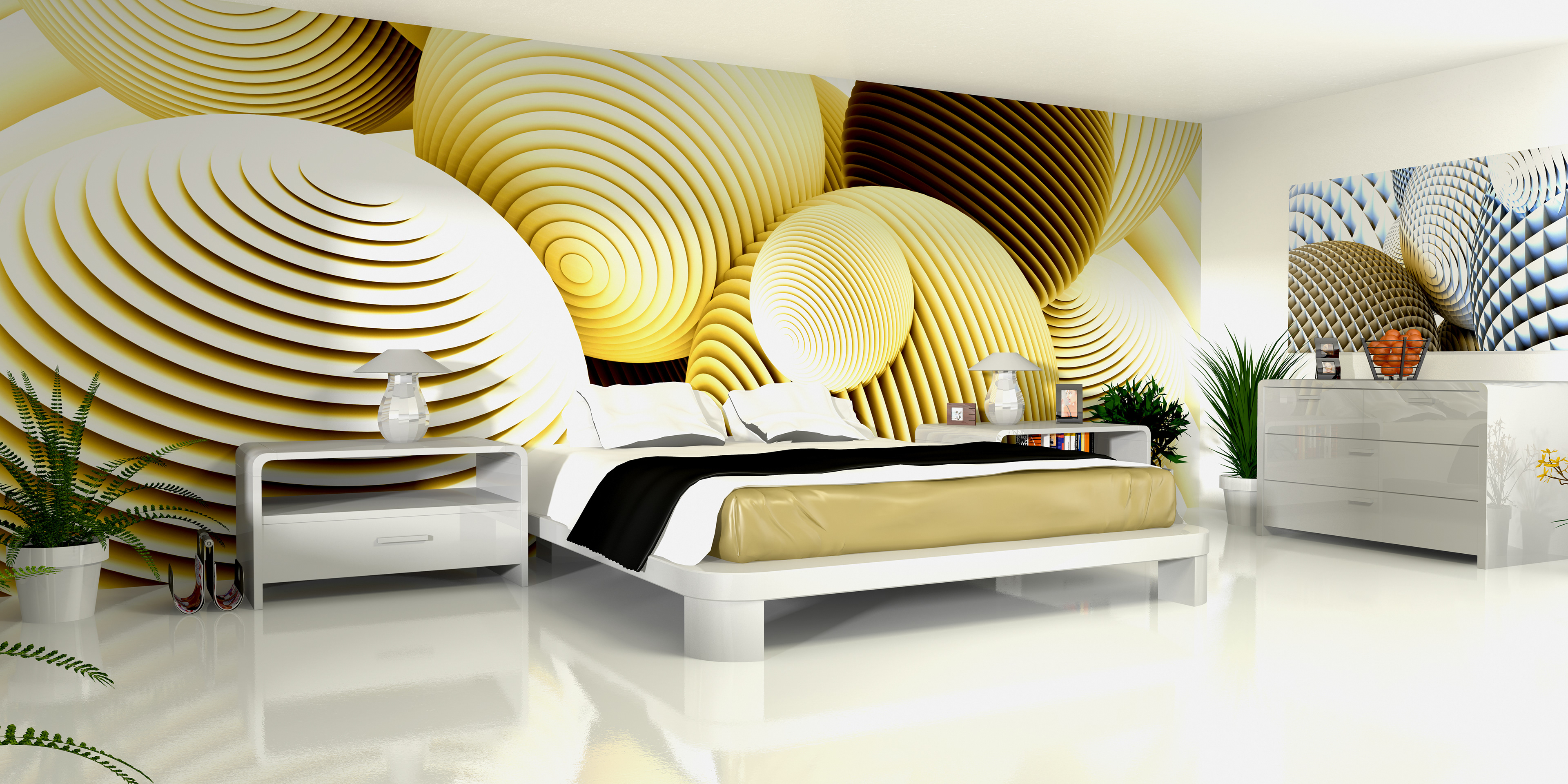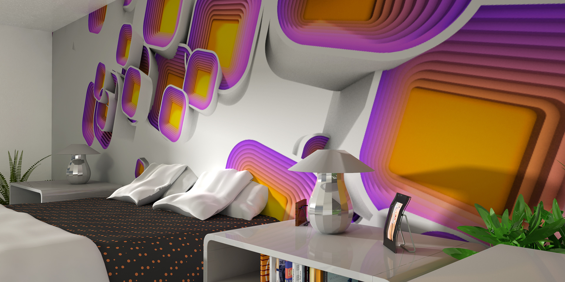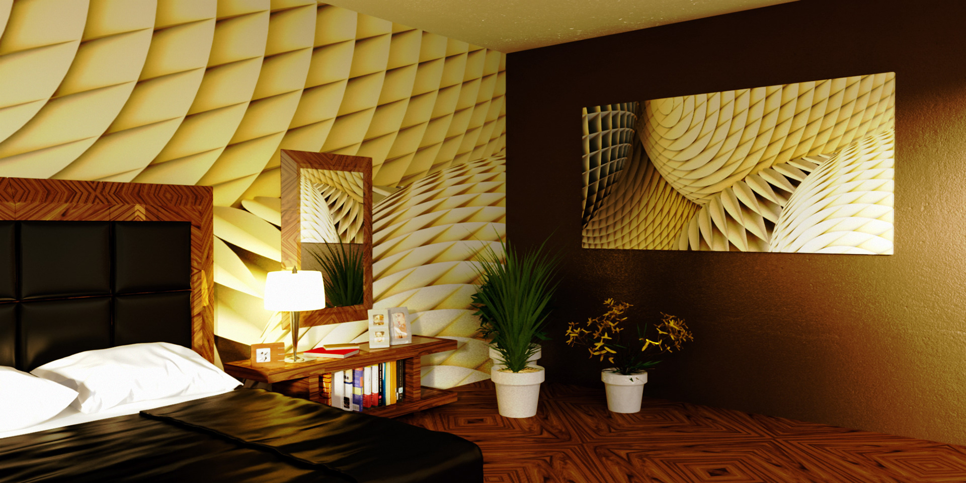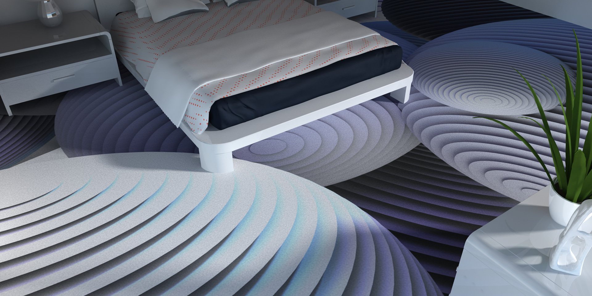 3D renders that are sold in 10 pieces limited editions. Printed in high resolution on wallpaper, canvas, glass, metal, tiling, furniture and carpet.